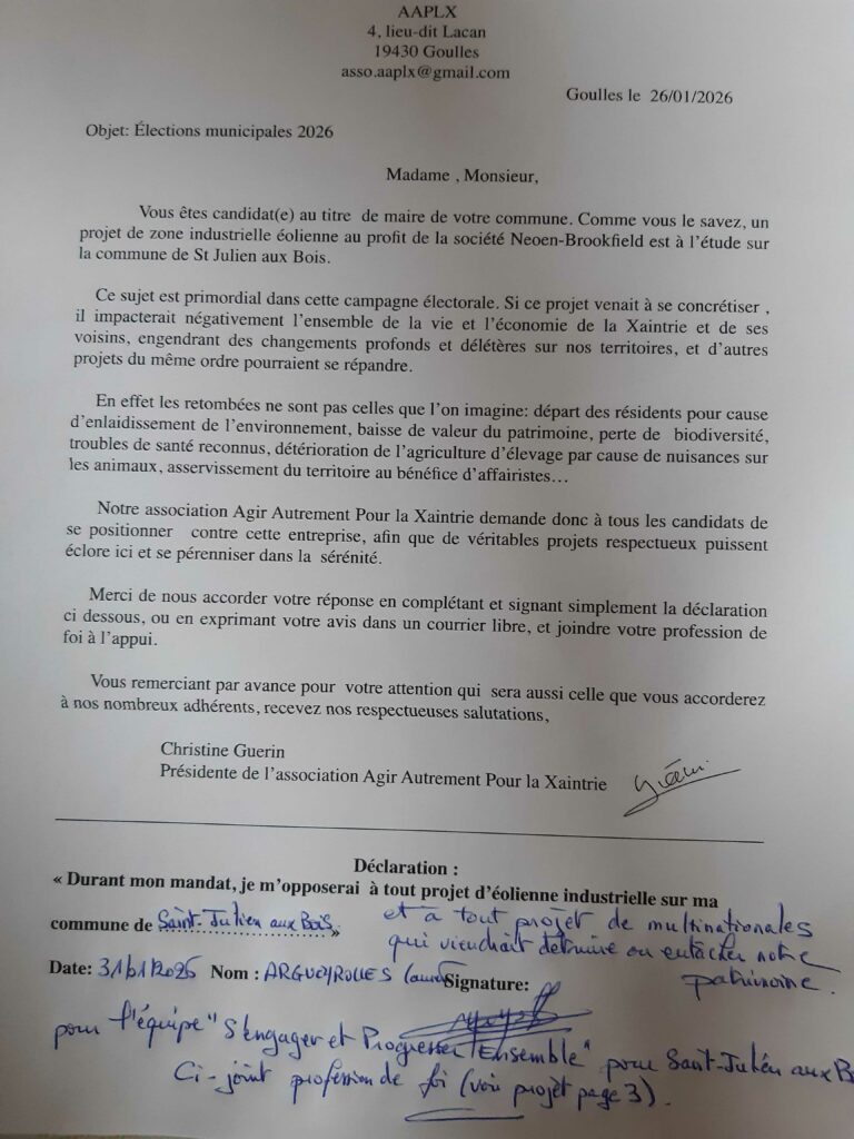 Les habitants de St julien aux bois s’insurgent contre le projet de destruction de nos lieux de vie par les industriels de l’éolien.